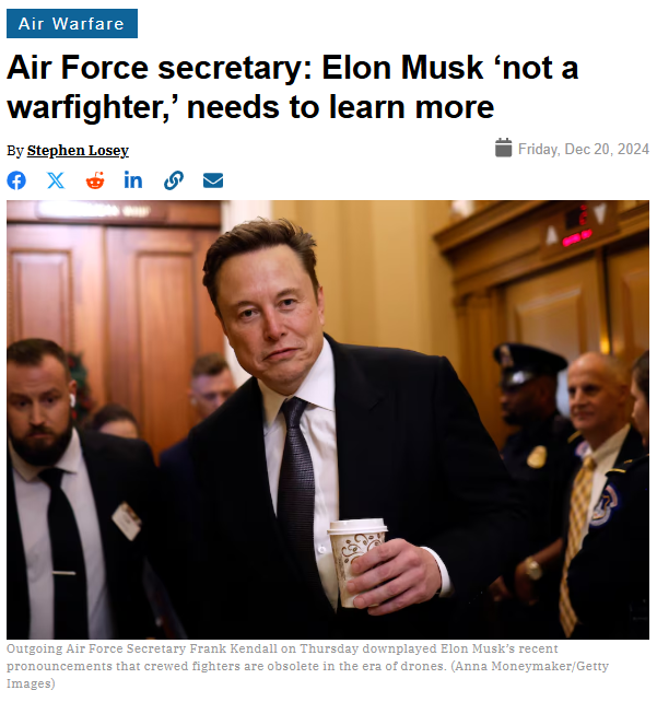 据美国防务新闻网报道,12月19日,即将卸任的美国空军部长弗兰克·肯德尔(Frank Kendall)针对埃隆·马斯克关于载人战斗机在无人机时代下已经“落伍”的说法进行回应,称他“并非作战人员”,并建议这位亿万富豪实业家多了解一下军事。