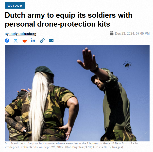 荷兰国防部国务秘书吉斯·图因曼(Gijs Tuinman)在致议会的一封信中写到,近年来在各地区的战场上,无人机的威胁日益严峻,但目前荷兰缺乏有效自卫的必要装备,因此,荷兰计划在2025年第一季度为士兵采购反无人机装备。