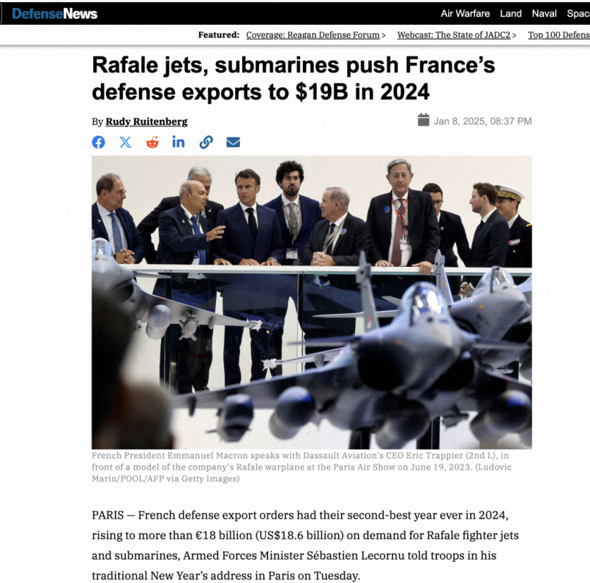 根据斯德哥尔摩国际和平研究所(Sipri)的统计,在2019年至2023年间,法国是仅次于美国的世界第二大武器供应商,占全球武器出口的11%。