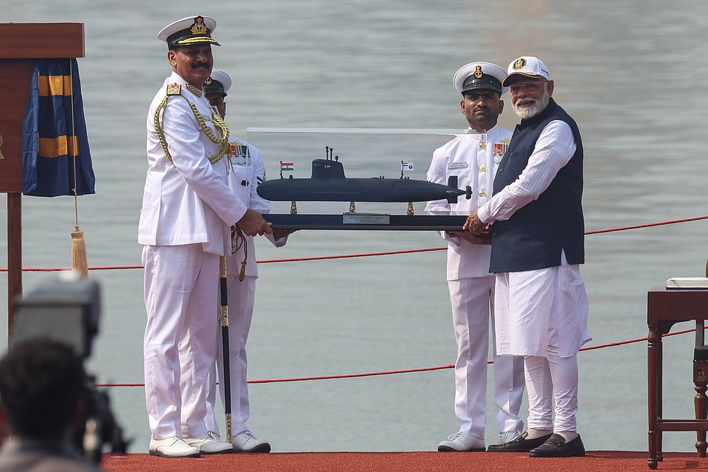 当地时间1月15日,印度海军参谋长迪内什·库马尔·特里帕蒂(左)在印度海军三艘前线舰艇的入列仪式上向印度总理莫迪赠送了印度海军潜艇Vaghsheer的模型。(视觉中国)
