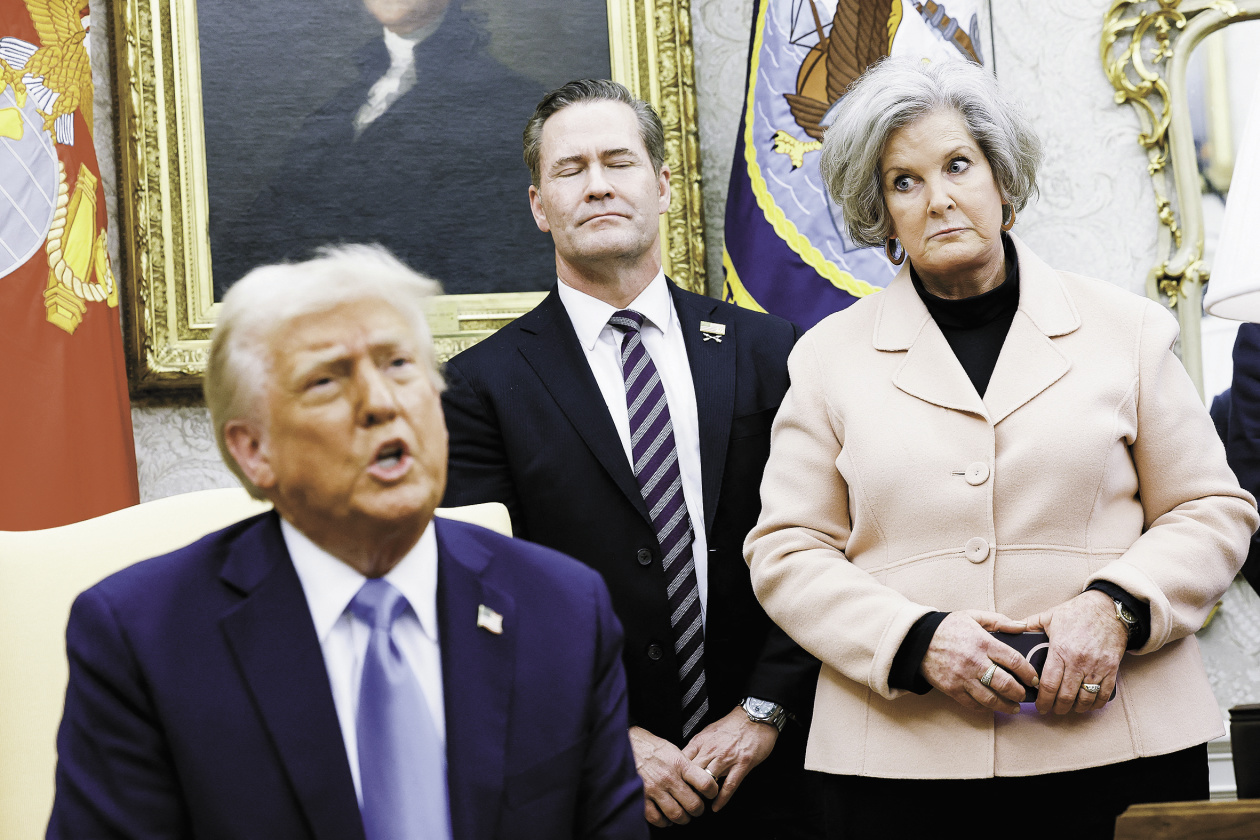 当地时间4日,特朗普在白宫宣布“美国接管加沙”的计划时,白宫幕僚长苏西·怀尔斯(右一)的表情被媒体捕捉到。图源:法媒