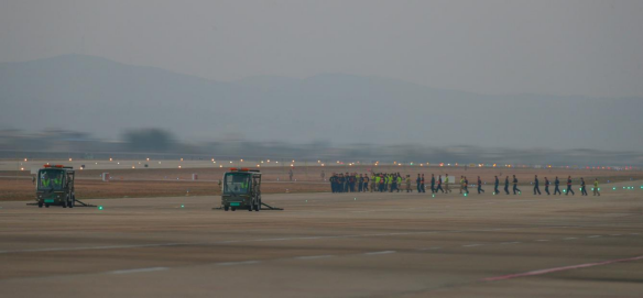 空中激战火热,地面密切协同。驱鸟净空、传信云天、精准导航……正午时分,浓雾渐退,在场区内外,地面各保障分队密切协同开展保障工作,为战鹰保驾护航。