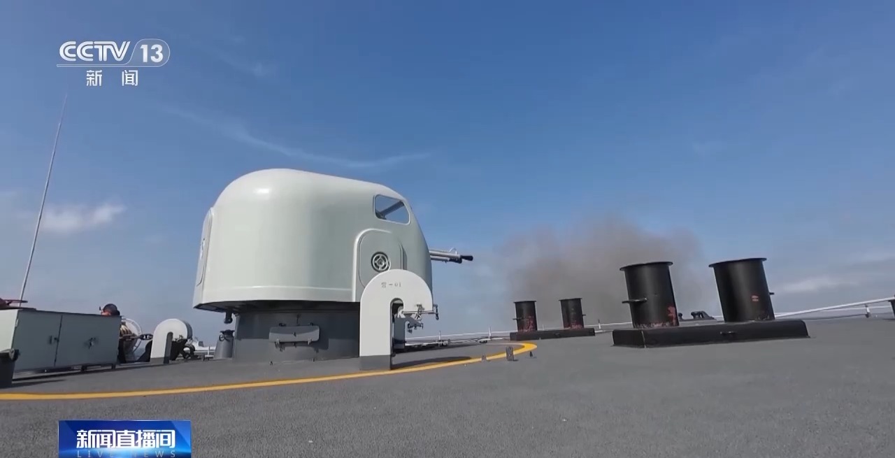 在编队各舰号手精确操作下,数枚炮弹呼啸而出,对“敌”目标实施有效火力打击。