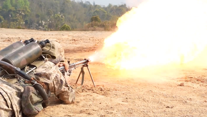 近日,陆军某旅组织防化专业开展实喷训练,官兵在规定时间内完成油料装填并自主选择射击姿势,利用模拟设置的战场地形地物,对“敌”碉堡、火力点等目标进行喷火训练,进一步检验防化分队的应急作战能力。(吕雄 池俊成 高斗 邱学文 张徐强)