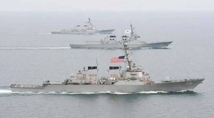 并肩航行的美国“阿利·伯克”级与韩国“世宗大王”级驱逐舰
