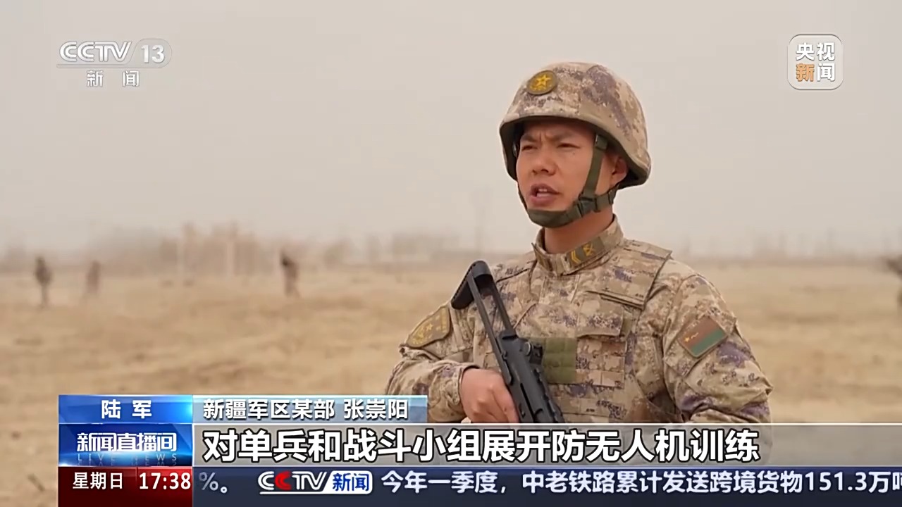 新疆军区某部 张崇阳:我们针对无人机作战需求,对单兵和战斗小组展开防无人机训练,研究探索战场环境“闪躲防”、现地工事“加装防”、新域手段“科技防”三种方法,提升无人机反制打击能力。