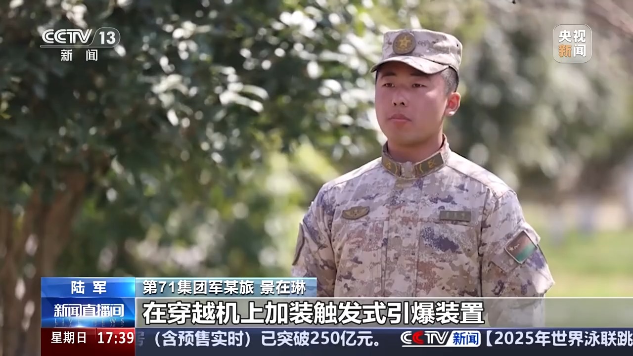 第71集团军某旅 景在琳:我们充分借鉴现代战争中无人机作战样式,在穿越机上加装触发式引爆装置,做了大量实验,最终实现飞机接触敌人的瞬间引爆雷管,达到精准杀伤的效果。