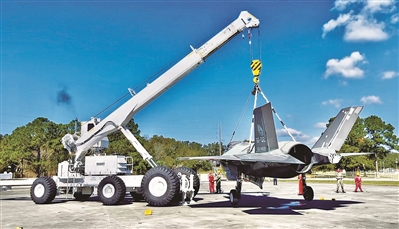 上图中,一台造型独特的救援起重机,轻松吊起一架空重超过14吨的F-35B战斗机,展现出“大力士”的实力。