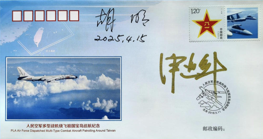 “陆军、海军、空军、火箭军,画出一个‘解放台湾’的同心圆。人民解放军有坚定的意志、充分的信心、足够的能力,捍卫国家主权安全和领土完整!”说到这里,胡明和申进科在“人民空军巡航台湾岛”邮封上共同签字,表达了两代军事新闻人的共同心愿:期待着祖国完全统一的那一天早一点到来!(郑义生)