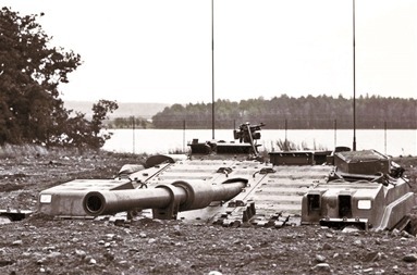 上图中,一辆坦克将车身置于掩体之后,从远处看,地表上只留下微微隆起的车顶和一根黑黢黢的炮管。这便是瑞典Strv 103主战坦克。
