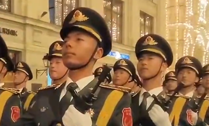 中国人民解放军仪仗司礼大队在红场参加彩排。“中国排面”亮相莫斯科街头,唱响《强军战歌》《歌唱祖国》等,受到中国留学生和当地民众热烈欢迎。当解放军仪仗司礼大队走过莫斯科街头,人们高呼“不追网红不追星,只追中国仪仗兵”。(总台记者 王斌 员志军)
