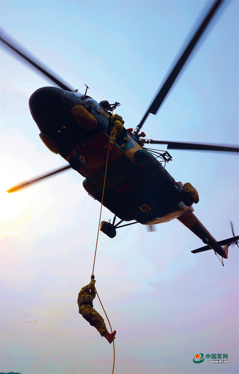 打击完毕,运输直升机低空突入“战场”,采取机降和索降方式实施兵力投送。着陆后,作战队员迅速组成战斗队形投入战斗,对“敌”残余力量展开围剿……(陈 宇 解放军报记者 胡云艳 特约通讯员 张欢朋 摄影报道)
