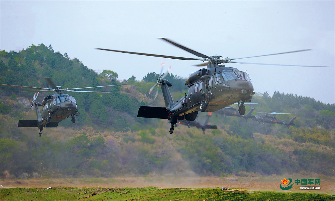 某训练场,一发信号弹划破天际。多型满载作战队员的运输直升机,与伴随掩护的武装直升机接续升空,随后完成编组飞赴目标空域。