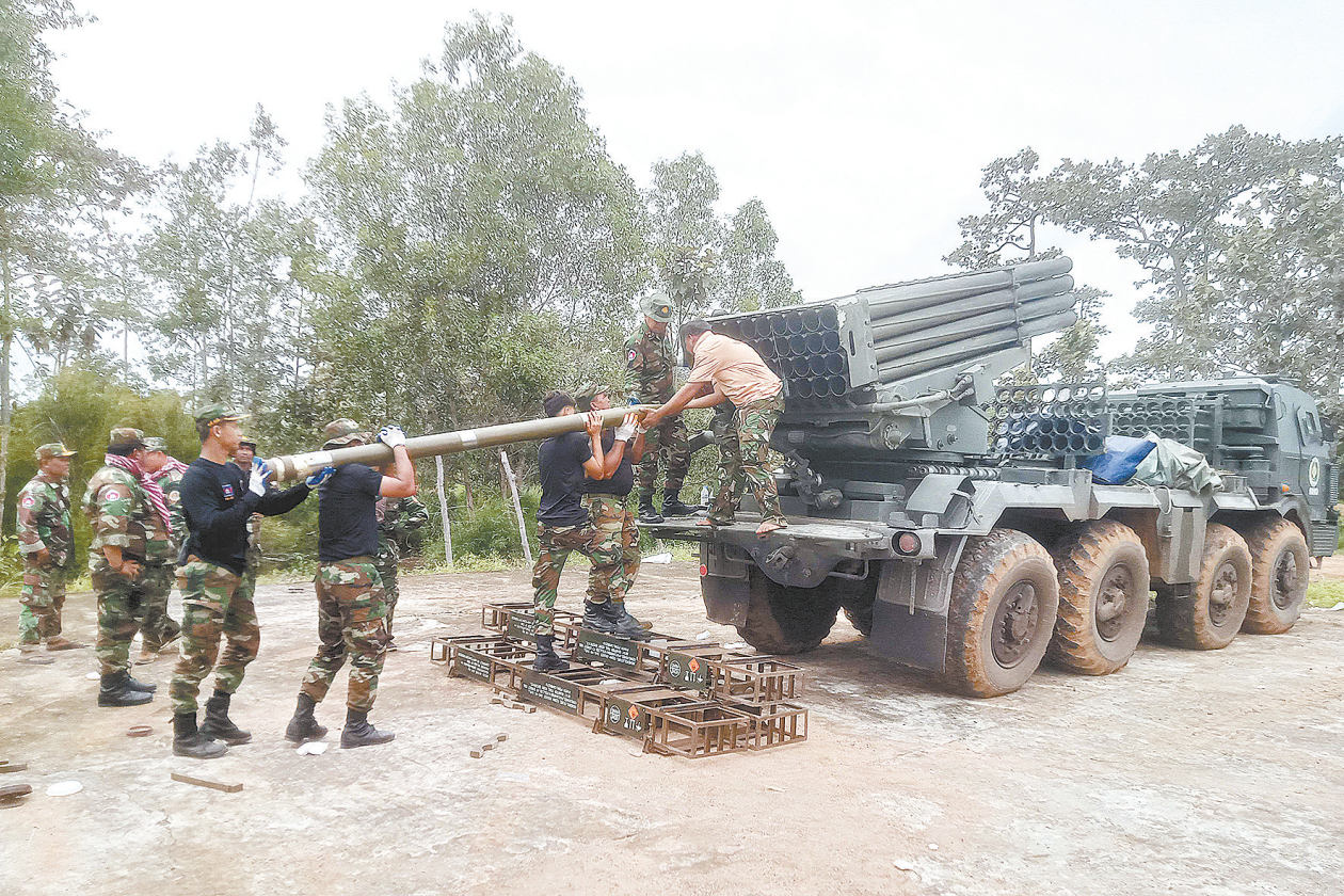 24日,柬埔寨士兵在柬泰边境地区为火箭炮装填弹药。 (视觉中国)