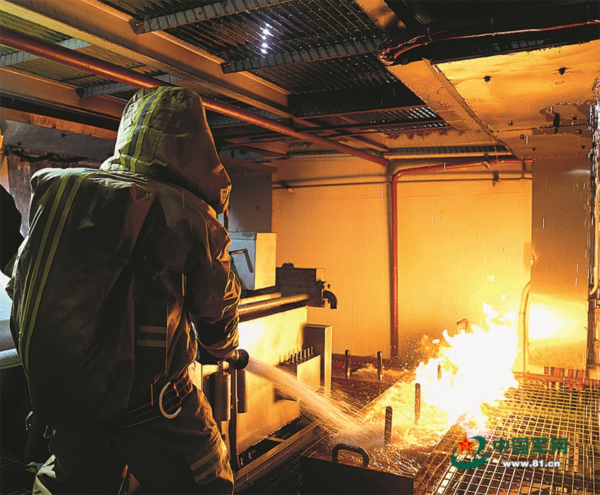 “潜艇遇袭”,模拟舱室突现“火情”。指挥员下达“封舱灭火”指令,损管队员立即穿戴防火服,携带灭火器材奔赴“起火”舱室,迅即投入灭火战斗。