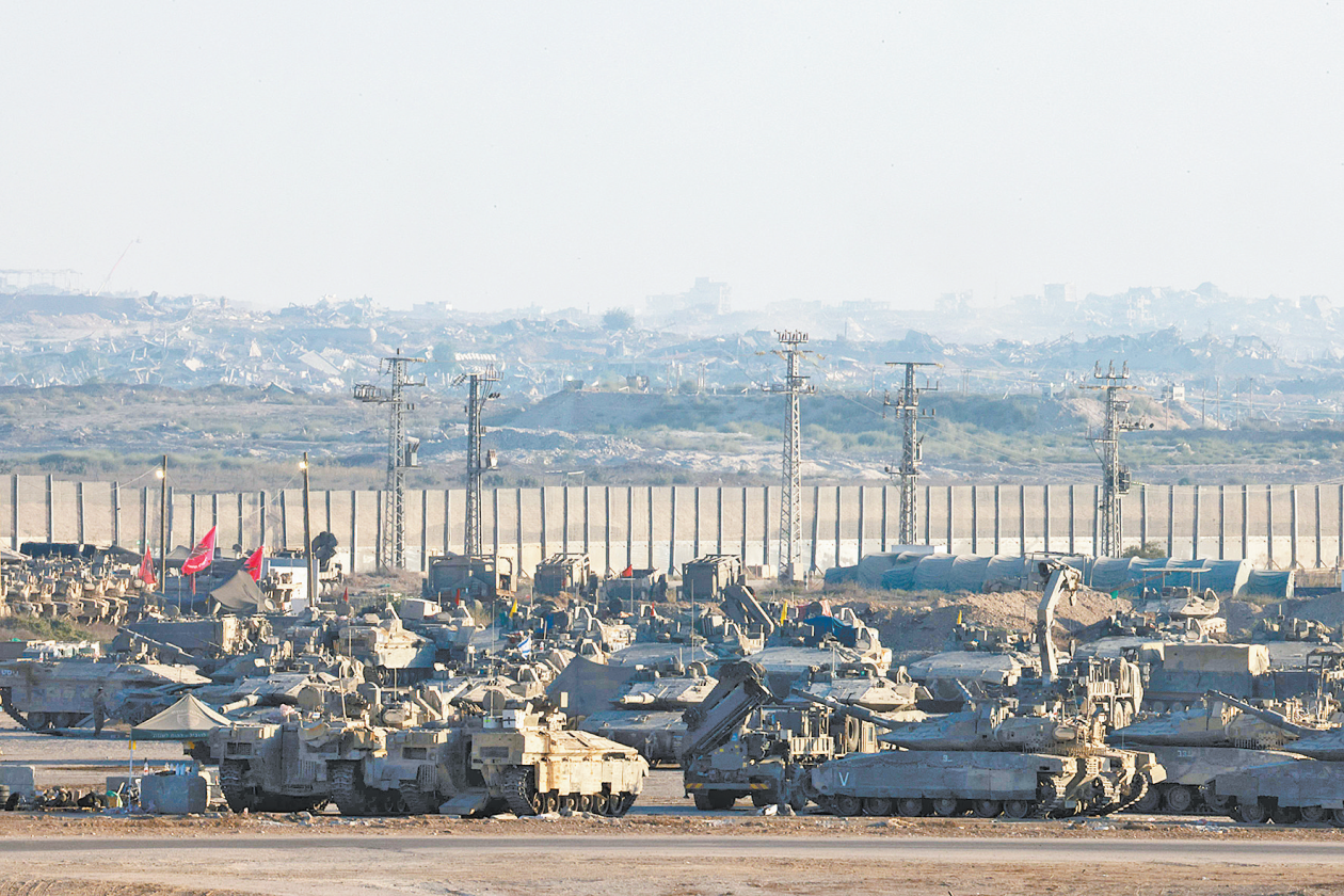 9月16日,以色列装甲车驻扎在与加沙地带毗邻地区,远处是被摧毁的加沙地带建筑物。(视觉中国)