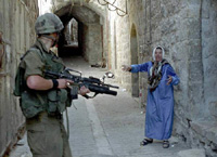 一个全副武装的以军士兵,一位手无寸铁的巴勒斯坦老妇;一个持枪冷漠以对,一个振臂愤怒质问。作者有意选取强与弱紧张对峙的情节画面,采用对比的手法对这种强弱悬殊加以强化。