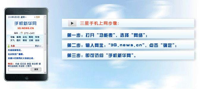 三星:依次选“上网键”-“收藏夹”-选择一个空的收藏夹地址-确认url地址-输入“手机新华网”