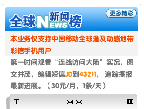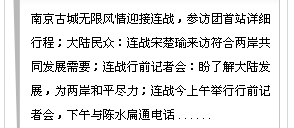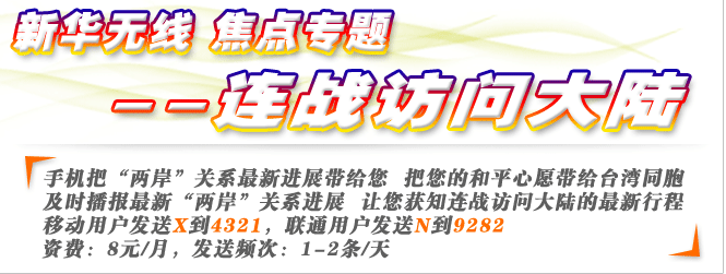 | |  | 130****3356 | | |  | 从连战先生的演讲不仅可以较完整地了解国民党对目前局势的看法,也可全面展现的他的风采, 亮点啊 | |  | 135****0855 | | |  | 一国定乾坤,两岸齐努力,三通早实现,四季同发财,五十分裂苦,六载相思情,七夕和平愿,八方统一声,九州欢庆日,十全同胞聚。 | |  | 133****7785 | | |  | 连战先生在北大的讲话洋溢着爱国情怀!很受感动!他学贯中西,又有一个热爱中华的心,很难得! | |  | 136****6332 | | |  | 大陆“以人为本”、务实、理性、积极、善意的对台政策深得岛内民心,台当局以“一边一国论”为核心、倒退、防堵、封闭的大陆政策不得人心。 | |  | 138****5598 | | |  | 连战大陆行说明缓和、发展两岸关系仍是岛内主流民意,更说明我们“以人为本”的对台政策深得民心。 | |  | 137****6645 | | |  | 国家最终应该统一,统一符合包括2300万台湾同胞在内的全体中华儿女的根本利益,是两岸同胞的最大福祉所在。 | |  | 139****8898 | | |  | 我们可以和国民党开诚布公地谈,可以和亲民党诚恳友好地谈,可以和民进党有原则地谈,还应邀请更多能够代表台湾同胞的各界人士推心置腹地谈 | |  | 138****3365 | | |  | 好样的连战,你的到来开启了早已蕴藏在大家心中的期盼和平、盼望统一的热情。 | |  | 133****6552 | | |  | 台湾其他领导人也来祖国大陆看看吧,到时我想你们的思想一定会转化的。 | |  | 136****7723 | | |  | 在当前复杂多变的形势下,连战主席能排除干扰,率中国国民党代表团来大陆访问,作为一个中国人,对此举表示真心的赞赏和欢迎 | |  | 130****5656 | | |  | 连战来大陆是促进两岸关系的好事情,第一站就来南京,作为南京市民我们很高兴。 | |  | 133****6698 | | |  | 连战先生能来,深明大义。让围堵压中华民族发展和掘起的国家看看,中国人不是窝里斗的孬种! | |  | 136****6925 | | |  | 能来的都是好同志,我代表自己,对连同志的到来表示热烈欢迎!阿扁搞"台独"咱们就不理睬他。 | |  | 130****8677 | | |  | 大陆好,台湾也就好,大陆不好,台湾想好也难。眼光应该着眼在“大”字上。 | |  | 133****3749 | | |  | 衷心希望早日实现三通,两岸在经济、文化、科技等方面促进交流和融通,早日实现祖国和平统一大业,实现中华民族的伟大复兴! | |  | 139****4758 | | |  | 同为炎黄子孙,本当友好共处,着眼同胞情谊,携手共同发展,坚持一个中国,对话解决问题;加强经贸交流,希望常来常往,维护和平统一 | |  | 138****8863 | | |  | 国民党来大陆访问,可谓上了台阶,与民进党拉开了档次。 | |  | 133****6636 | | |  | 意义非凡。若江山有思,亦会动容。 | |  | 138****8868 | | |  | 统一的路还很长,不要以为连宋来了就行了。同志们,还要再加一把劲呀。 | |  | 139****3368 | | |  | 中国的发展、富裕、强大是每个有中国血统的人的共同心愿,望连先生领导的中国国民党在中国的历史进程中能抓住历史给予的这个机遇 | |  | 133****8834 | | |  | 欢迎连先生到访!中国人只有真正团结起来,才能抗击外辱,重振泱泱大国的威名! | |  | 138****5578 | | |  | 欢迎连主席来访! | |  | 137****6848 | | |  | 若是为中国的统一事业而来,我们欢迎! | |  | 139****8787 | | |  | 台湾现正站在历史的十字路口,台独没出路,政治家要把握好机会,以民众为重,以理智相处,造福人民,翻开历史新篇章 | |  | 136****2223 | | |  | 欢迎连宋破冰。希望通过这次来访了解13亿大陆人民对台湾人民的骨肉深情和祖国大家庭的和睦团结,共同反对“分裂主义”。 | |  | 130****6752 | | |  | 历史将记住为祖国和平统一作出贡献的人 | |  | 133****6642 | | |  | 中华民族是一个大家庭,都是炎黄子孙,我们只有一个国家,那就是大中国,统一的国家才能不被别人欺凌,海峡两岸人民要和平,不要分离,携手共建大中华 | |  | 138****2219 | | |  | 我是一名司机,交通部门与交警在管理上为何不一致?我们何时有一个稳定的运输环境? | |  | 138****6865 | | |  | 全国九亿多农民何时也能像城镇居民一样享受到国家福利性的医保和社保? | |  | 138****2256 | | |  | 现在的听证会与涨价会无异,政府会采取什么措施制止一些垄断行业随意涨价行为,保护消费者的合法权益? | |  | 138****8782 | | |  | 请问温总理:政府将采取哪些措施规范国有企业当前的改制,怎样防止国有资产流失?特别是对当前职工的利益将采取哪些措施予以维护? | |  | 135****4713 | | |  | 房价高得离了谱,并且还在涨,对普通老百姓来说是一个天文数字,让老百姓怎么买得起? | |  | 139****5094 | | |  | 我会问总理:什么时候开发中部?因为没人去安徽找工作 | |  | 138****6522 | | |  | 我是湖北一个不起眼的小县城人,想请问温总理,农村退耕还林是一种什么样的举措?老百姓能否得到实惠? | |  | 137****1982 | | |  | 请问总理,中央对于司法腐败和行政腐败将采取什么措施防治? | |  | 139****8596 | | |  | 农村小学校乱收费、乱补课、乱捐款收费,使多少家庭苦上加苦,负担太重 | |  | 137****5967 | | |  | 如何看待有些私营企业非人性化管理:签不平等合同、劳动时间过长、不准病假、没有工伤医疗费、民工无说话权利… | |  | 139****3889 | | |  | 外贸企业长期拖欠职工社保费,不办医保,企业没效益,职工下岗啦,生活无保障,职工自己想交又交不起乍办?国家有何政策? | |  | 138****5437 | | |  | 我是东海临时工,工作二年没有签合同,这合法吗? | |  | 139****9092 | | |  | 现在虽然农业税减了,但有关的集资、收费还不少,而且一直是某