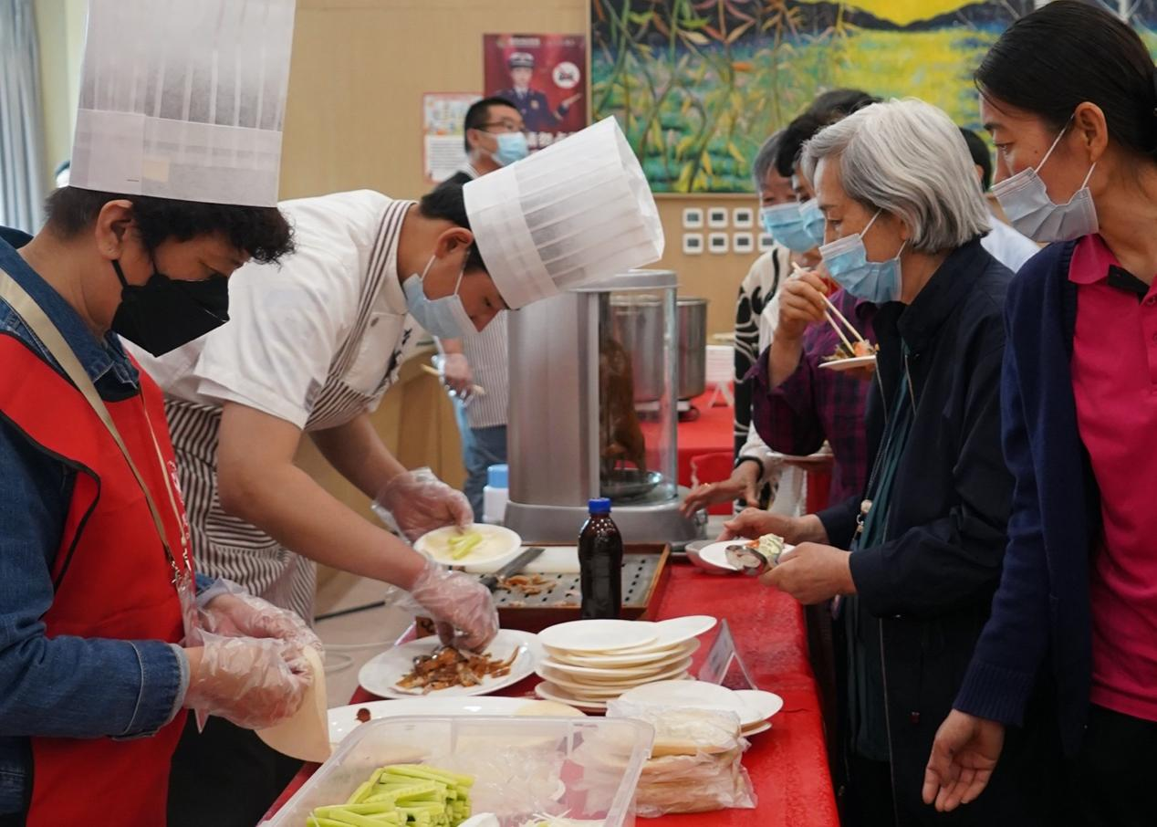 北京美食自然少不了烤鸭。挂炉烤鸭和焖炉烤鸭是北京烤鸭的两大流派。此次活动为长辈们准备的是焖炉烤鸭,平均年龄达84岁的“美食家”们对于烤鸭的热情极高,着实把片鸭师傅忙得应接不暇。