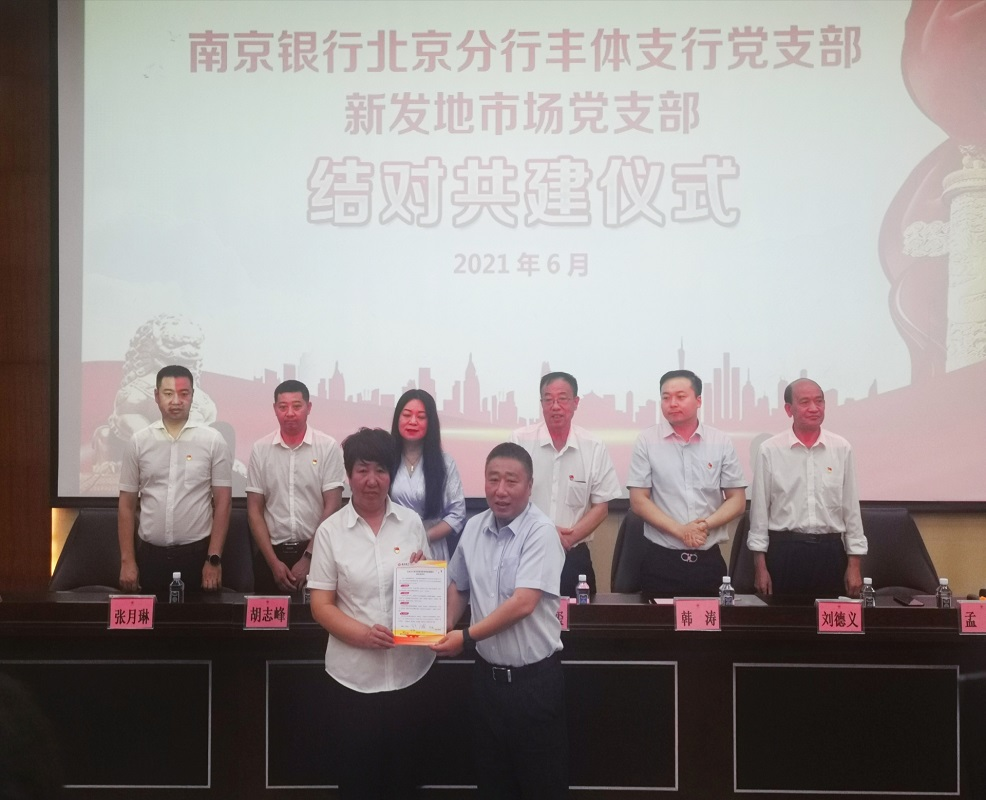 近日,北京新发地市场“学党史、感党恩”主题党日活动暨南京银行北京丰体支行党支部与新发地市场党支部结对共建仪式在新发地国际农产品会展中心报告厅如期举行。共建仪式上,南京银行北京分行丰体支行党支部书记、行长孟平代表支部全体党员同志宣读并递交金融服务承诺书,承诺将“以市场为导向,以客户为中心,始终坚持为客户提供高效金融服务,快速响应、全心投入,业务推动善始善终,客户需求24小时内有反馈,放款操作第一时间落实......”。