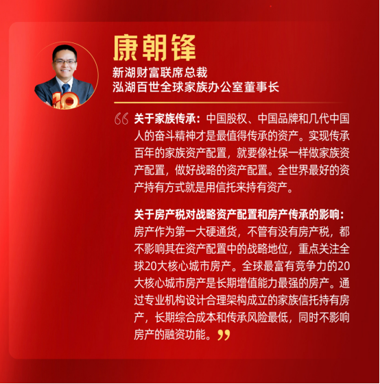 在家企传承主题专场,新湖财富联席总裁兼泓湖百世全球家族办公室董事长康朝锋,就房产传承分享真知灼见,以帮助用户了解如何科学高效地实现房产传承。