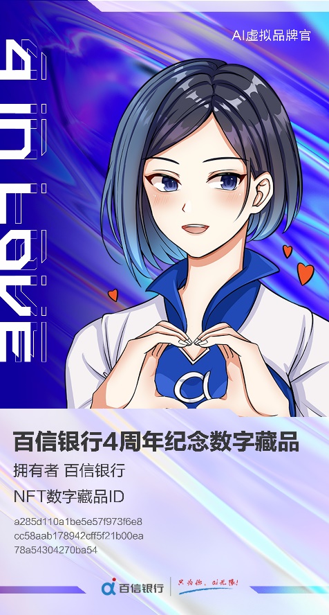 11月18日,百信银行发行了“4 in love”四周年纪念数字藏品,同步推出了“AI虚拟品牌官”的二次元形象,塑造了富有科技感和时尚感的虚拟IP。该藏品基于区块链技术发行,具有唯一性和不可篡改性,拥有者为百信银行,是银行业首个NFT数字藏品。
