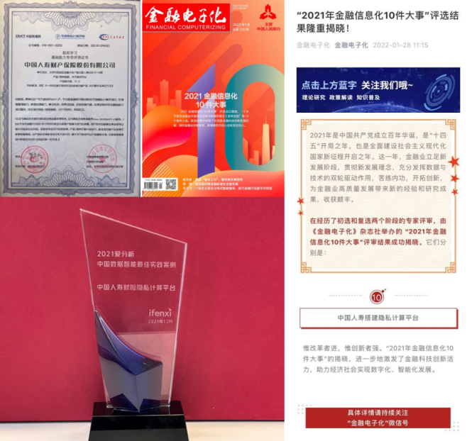 例如,成功通过工业和信息化部直属科研事业单位中国信息通信研究院公布的第五批“可信隐私计算评测”评审中“联邦学习 基础能力”专项评测;荣获国内领先的产业数字化研究与咨询机构爱分析所评选的“2021爱分析·中国数据智能最佳实践案例”;成功入选中国人民银行主管、我国金融信息科技类主导期刊《金融电子化》杂志所评选的“2021年金融信息化10件大事”,成为保险行业唯一入选的金融信息化大事件。