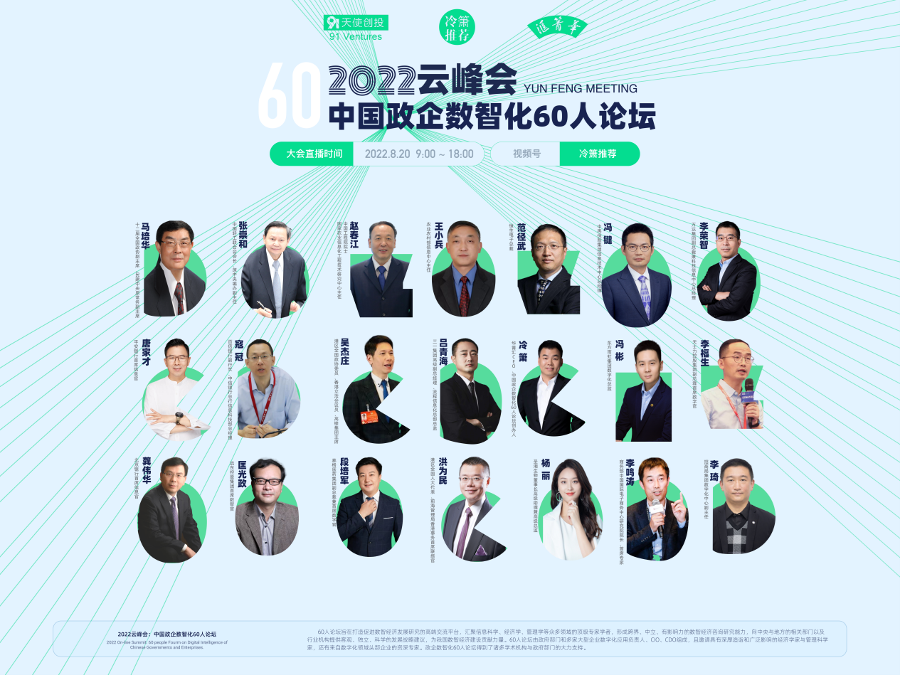 “由中国政企数智化60人论坛组委会与华箐汇、冷箫推荐、91天使创投、91活动网联合主办的“2022中国政企数智化60人论坛云峰会”,8月20日在线上举行。十二届全国政协副主席马培华,中国轻工业联合会会长张崇和,中国工程院院士、国家农业信息化工程技术研究中心主任赵春江,农业农村部信息中心主任王小兵,港区全国人大代表洪为民,港区全国政协委员吴杰庄等嘉宾出席云峰会并分别发表主题演讲。云峰会开幕式由中国政企数智化60人论坛创办人、华箐汇首席执行官冷箫主持。来自政府相关部门、行业协会,以及工商界、学界、媒体界等领域的全国各地1000余位精英翘楚,汇集云端,共享数智盛会,打造了一场开放共享、创新互动、安全高效的云端数智盛会。
