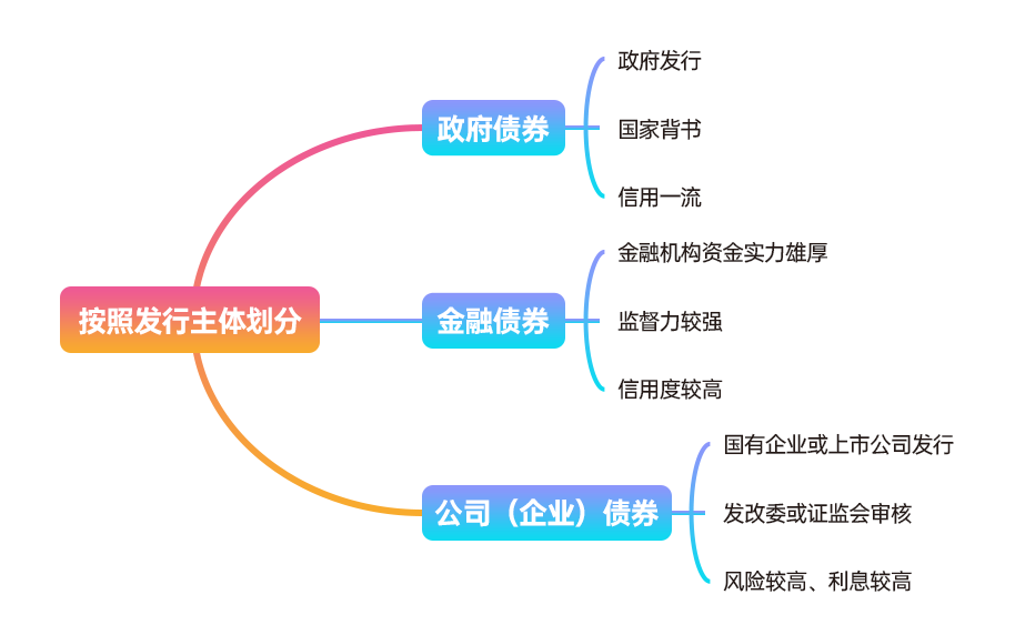 按照发行主体,债券一般分为政府债券、金融债券和公司债券。