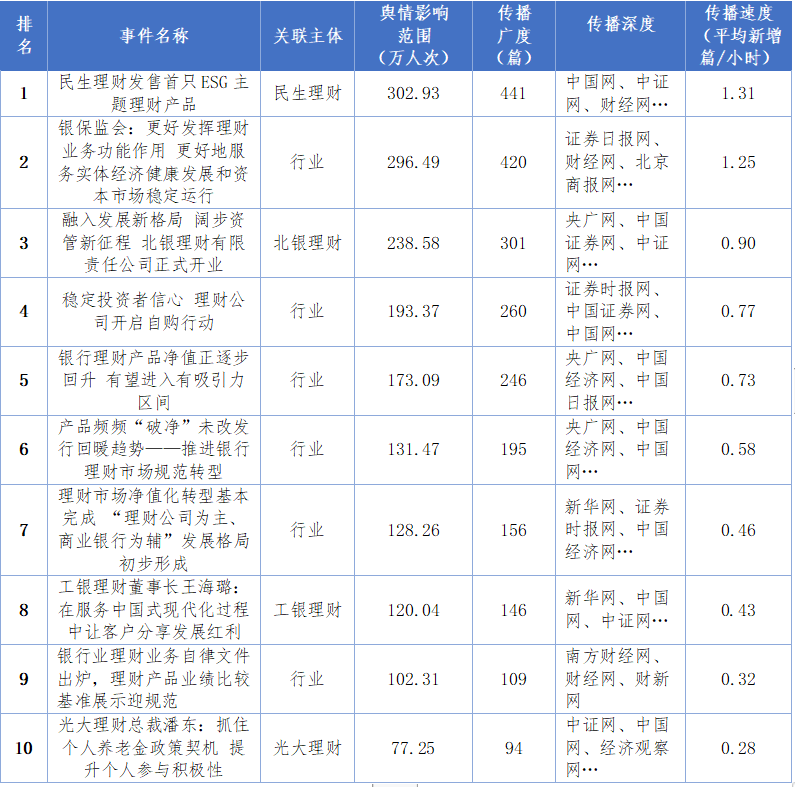 正面舆情主要集中在《民生理财发售首只ESG主题理财产品》《银保监会: 更好发挥理财业务功能作用, 更好地服务实体经济健康发展和资本市场稳定运行》《融入发展新格局 阔步资管新征程 北银理财有限责任公司正式开业》等方面;敏感舆情焦点主要是《买100万元理财产品亏损23万元!广发银行被判“全赔”》(人民日报数字传播微信公众号)、《宁波慈溪农商银行因委外理财业务管理不审慎被罚50万》(中国网)等。