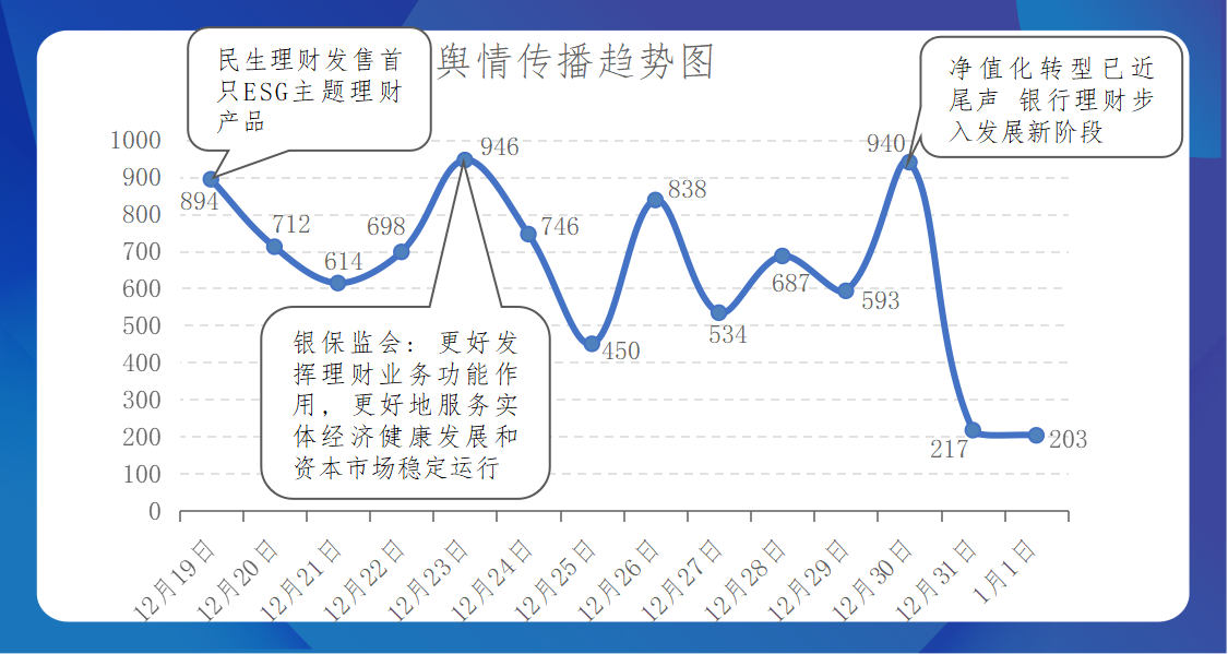 本时段内,行业舆情传播趋势起伏变化较大,最高峰值出现在12月23日心传播事件为“银保监会: 更好发挥理财业务功能作用, 更好地服务实体经济健康发展和资本市场稳定运行”。
