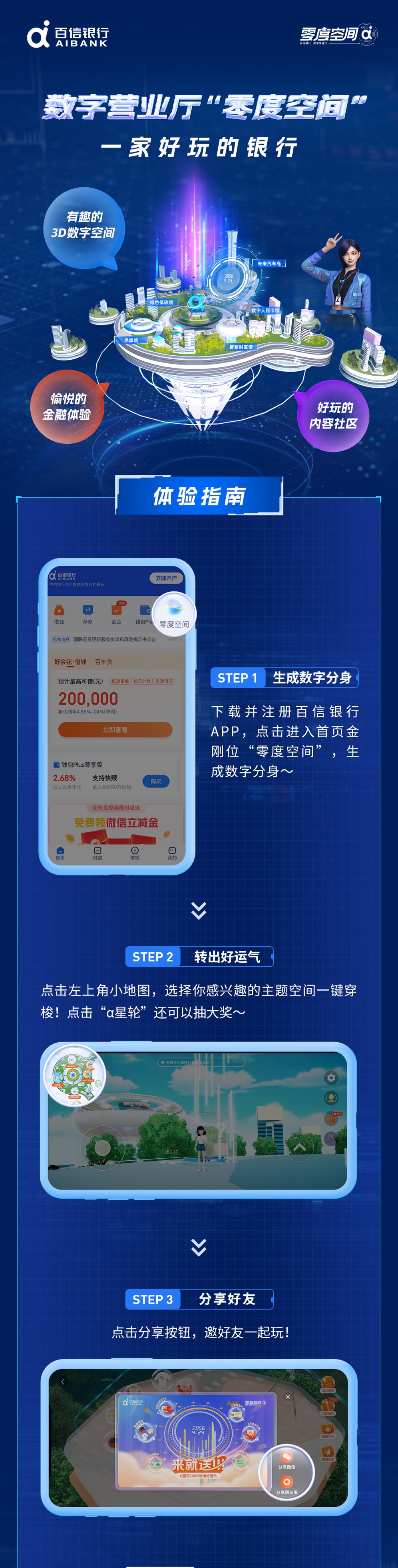 “零度空间”革新了传统银行的服务交互模式,在生成式人工智能技术的驱动下,通过构建更有趣的3D数字空间、打造更好玩的内容互动社区、营造更愉悦的金融体验三大产品亮点,为年轻用户提供全新的沉浸式数字金融服务。用户从百信银行APP首页进入“零度空间”,可以定制个性化、多模态的数字分身,实现与数字员工AIYA交流互动、购买专属理财产品、观看数字人直播、逛α星轮抽奖等全新极致体验。这既是百信银行对未来银行的一次全新探索,也是AIGC技术在数字银行的一次创新应用。
