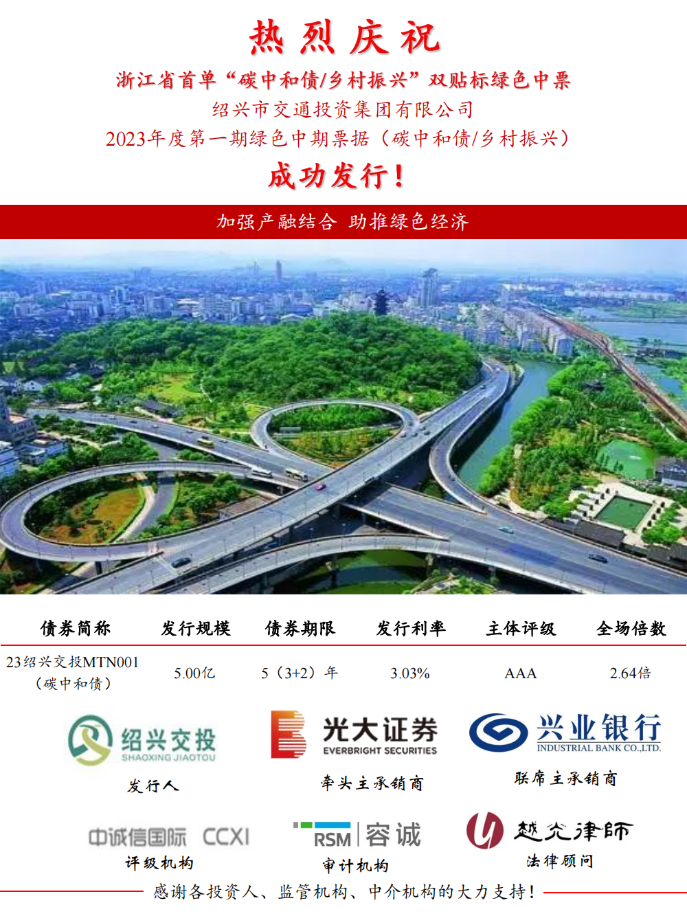 近日,光大证券牵头主承销的“绍兴市交通投资集团有限公司2023年度第一期绿色中期票据(碳中和债/乡村振兴)”发行,发行金额5亿元,期限为5(3+2)年,最终发行利率3.03%。本期债券为浙江省首单“碳中和债/乡村振兴”双贴标绿色中期票据。
