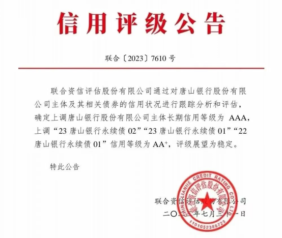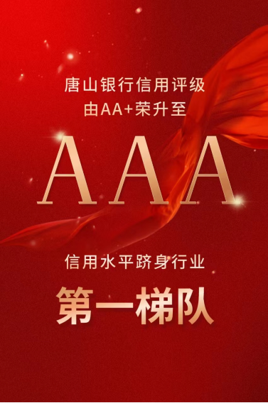 7月31日,经权威评级机构之一——联合资信评估股份有限公司评定,唐山银行股份有限公司主体长期信用等级上调为AAA,成功跻身国内企业信用等级第一梯队。