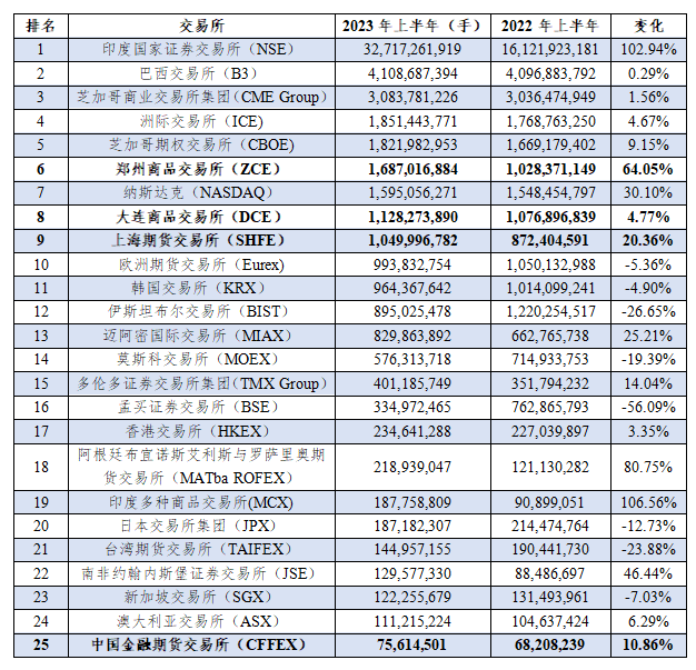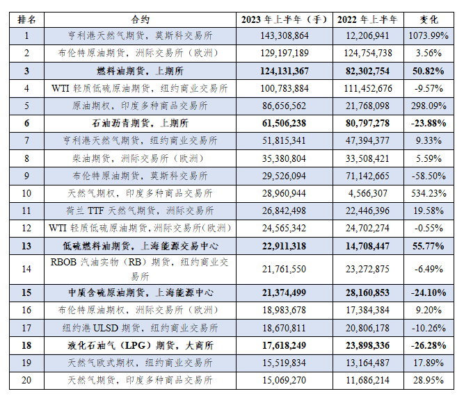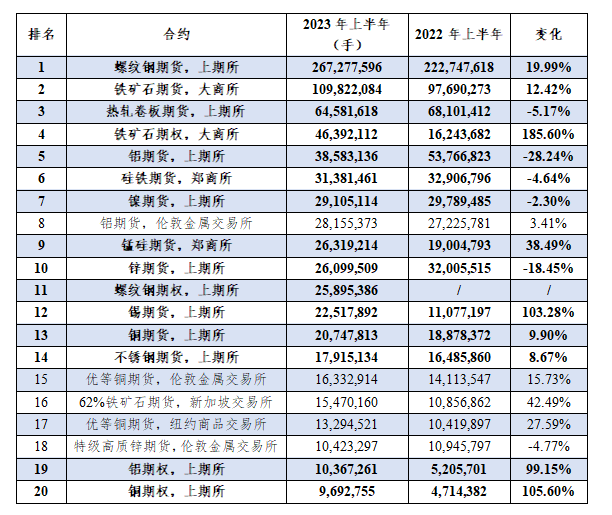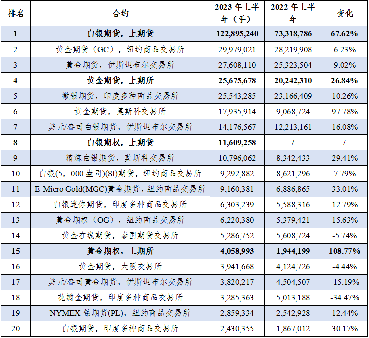 表5:2023年上半年全球贵金属期货和期权成交前20位
