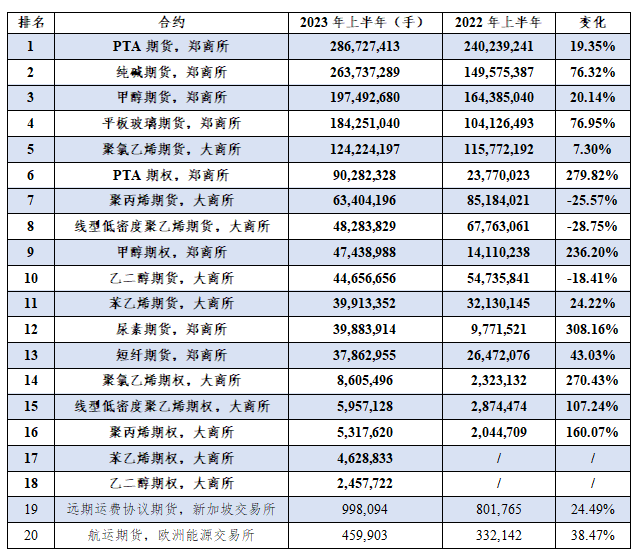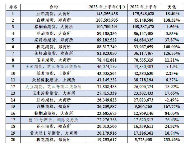 表2:2023年上半年全球农产品期货和期权成交前20位