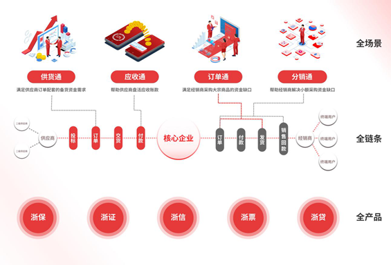 “降低融资成本、提升服务效率、稳链固链强链”是供应链的核心需求,浙商银行围绕产业链链主、实体企业上下游中小微企业真实交易背景的融资需求,应用数字化赋能和科技化手段,形成了覆盖主流场景的供货通、应收通、订单通、销售通“四通”供应链金融数智化服务模式,实现全链条、全场景、全产品的供应链金融服务。同时整合输出专业金融顾问服务和金融级风控能力,一站式满足产业链高质量发展需求。