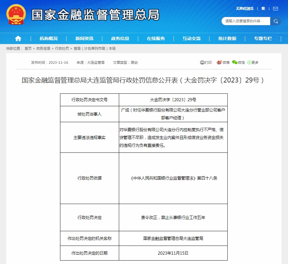 国家金融监督管理总局大连监管局11月16日发布的行政处罚信息显示,时任华夏银行股份有限公司大连分行营业部公司客户部客户经理广成对华夏银行股份有限公司大连分行内控制度执行不严格、信贷管理不尽职,造成发生业内案件且形成信贷业务资金损失的违规行为负有直接责任,被国家金融监督管理总局大连监管局责令改正,并禁止从事银行业工作五年。