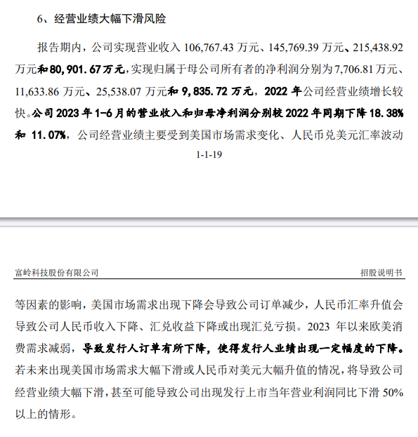 然而,进入2023年,富岭股份业绩却出现“滑坡”。2023年1-6月,公司实现营业收入8.09亿元,实现归母净利润9835.72万元,分别较2022年同期下降18.38%和11.07%。富岭股份在招股书中表示,2023年上半年,公司境外客户需求有所下降,导致订单有所下降,使得业绩出现一定幅度的下降。若未来出现美国市场需求大幅下滑、行业竞争大幅加剧或人民币对美元大幅升值的情况,将导致公司经营业绩大幅下滑,甚至可能导致公司出现发行上市当年营业利润同比下滑50%以上的情形。