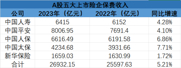 具体而言,2023年,中国人寿寿险公司实现原保险保费收入约6415亿元,总保费站上历史新高,位列行业首位;平安人寿以4665.4亿元、太保寿险2331.41亿元、新华保险1659.03亿元、人保寿险1006.34亿元。其比上年增幅依次为:4.3%、6.2%、4.9%、1.7%、8.6%。