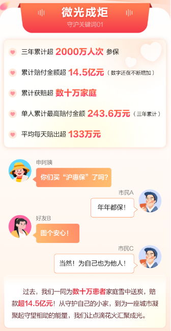 又一年新春到,这是”沪惠保”迎来的第三个新春。2021年4月27日,作为上海新晋的一张“城市名片”,上海城市定制型商业医疗保险“沪惠保”的“守沪之芽”开启,中国太保寿险作为主承保单位牵头各共保体保司,聚焦上海新老市民健康需求,坚持普惠金融定位,不断丰富普惠型保险服务内涵,三年来累计参保超2000万人次,创下多项记录,累计赔付案件近50万件。