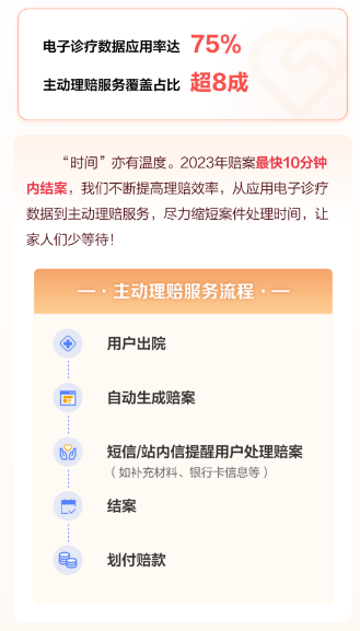 科技赋能提升理赔便利性,通过与大数据中心、医保中心、中银保信等多方联动,通过医保数据社会化应用,做到“让数据多跑路,民众少跑腿”,实现全程无纸化理赔,理赔电子诊疗数据应用率75%,一次性提交资料完成理赔的案件占93%。“时间”亦有温度,“沪惠保”平均结案时长2.3个工作日,最快仅10分钟内就完成结案,流程便捷、核赔高效,居于行业领先水平。