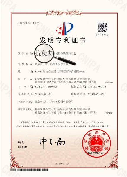 近日,北京同仁堂国药有限公司(以下简称“同仁堂国药”)下属子公司北京同仁堂(海南)控股有限公司(以下简称“海南公司”)申报的“一种抗衰老产品的制备方法及其用途”发明专利,获得国家知识产权局发明专利正式授权。