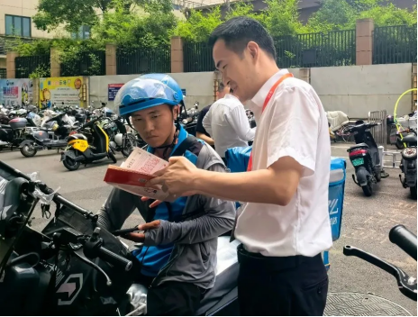 泰康人寿福建分公司的“消保志愿者”在为快递小哥义务解答