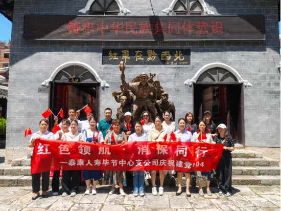 在贵州,泰康人寿贵州分公司毕节中支的员工们怀着崇敬的心情参观了川滇黔省革命委员会旧址。员工们在旧址广场齐声唱响经典红歌《没有共产党就没有新中国》,以歌声致敬革命精神。随后,泰康人寿毕节中心支公司工作人员在旧址大门口、八一希望学校、佳诚超市周围商圈等向过往群众、学生、老年人开展保险知识宣传活动,向群众普及保险基础知识,如保险的功能与作用、常见保险产品类型、如何选择适合自己的保险等,帮助群众树立正确的保险消费观念,提升风险防范意识。