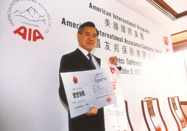 这张谢仕荣手持“中华人民共和国营业执照”的照片,拍摄于1992年友邦保险上海分公司开业典礼上,照片呈现的是中国政府发给外资保险机构的第一张牌照。这张无比珍贵的牌照,承载着友邦的回归梦,也证实了其渴望助力中国保险市场繁荣发展的信念和对中国市场的坚定信心。