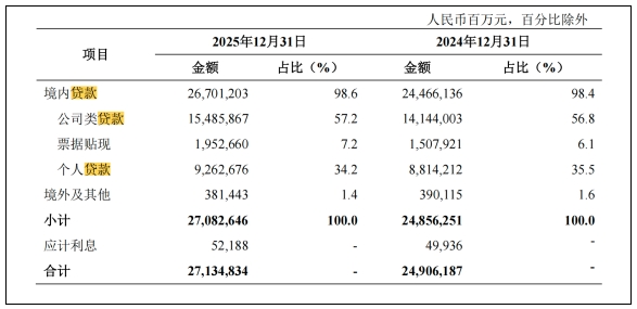年报数据显示,该行贷款总额27.13万亿元,新增2.23万亿元,较上年末增长8.9%。个人贷款余额9.26万亿元,新增4484.64亿元,增长5.1%,对公贷款(含票据)余额17.44万亿元,新增1.79万亿元。