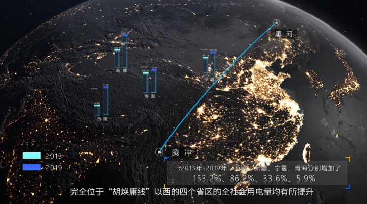 电网的建设和发展,让卫星得以在太空中捕捉更多的光亮。据电网数据统计,2013年-2019年,“胡焕庸线”以西方向覆盖省区的全社会用电量均有所提升。其中,完全位于西侧的西藏、新疆、宁夏、青海分别增长了153.2%、86.2%、33.6%、5.9%,西藏增长最为明显,全社会用电量持续多年保持全国前列。各地电网为社会经济发展提供了坚强的电力保障。