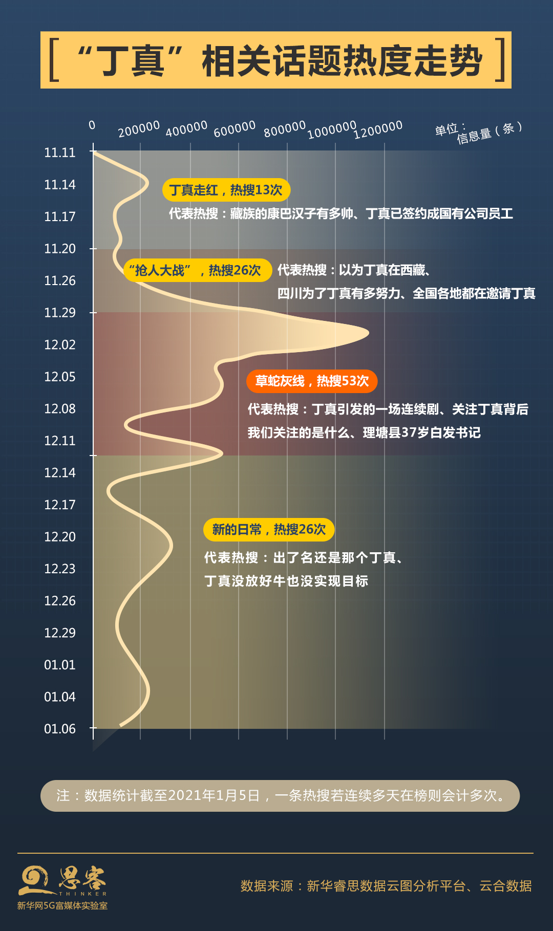 “这只是露出的冰山一角,背后是无数人的努力”“这样的热搜给我多上点”“咱们国家还有许多这样的扶贫干部”“机会留给有准备的人”……网民的震惊、自豪和感动,让丁真相关话题在12月1日达到热度峰值,当日信息量超1100万条。